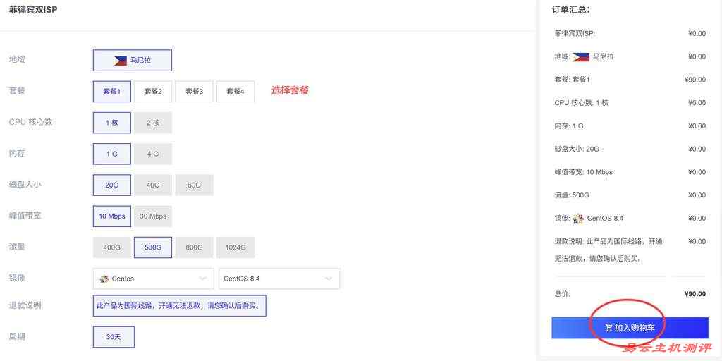 进入套餐配置页面后,可以看到4个套餐,选择其中一个套餐点击【加购物车】: